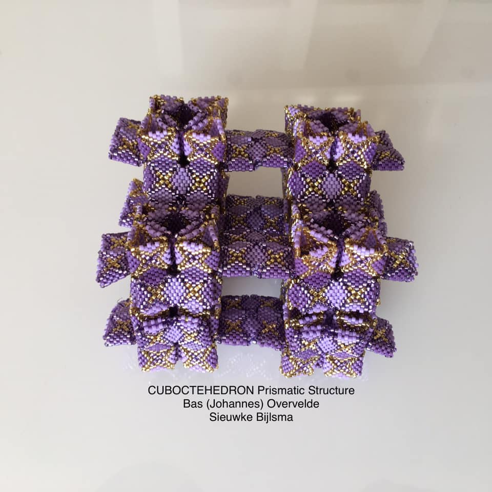 I recently wrote about reconfigurable materials – materials or surfaces which can be folded into different shapes in a similar way to kaleidocycles or folding cubes. Diane Fitzgerald posted a challenge in the Johnson Solids Project group on facebook to try making beadwork versions of some of these structures and there have been some amazing responses. I’m really excited to be able to show one of these pieces here, a cuboctahedron prismatic structure made by Sieuwke Bijlsma. It’s absolutely stunning!