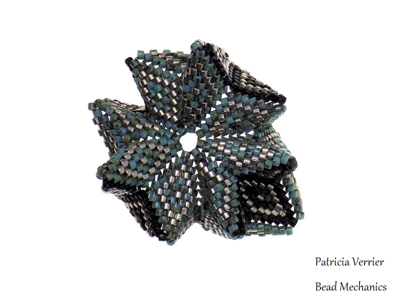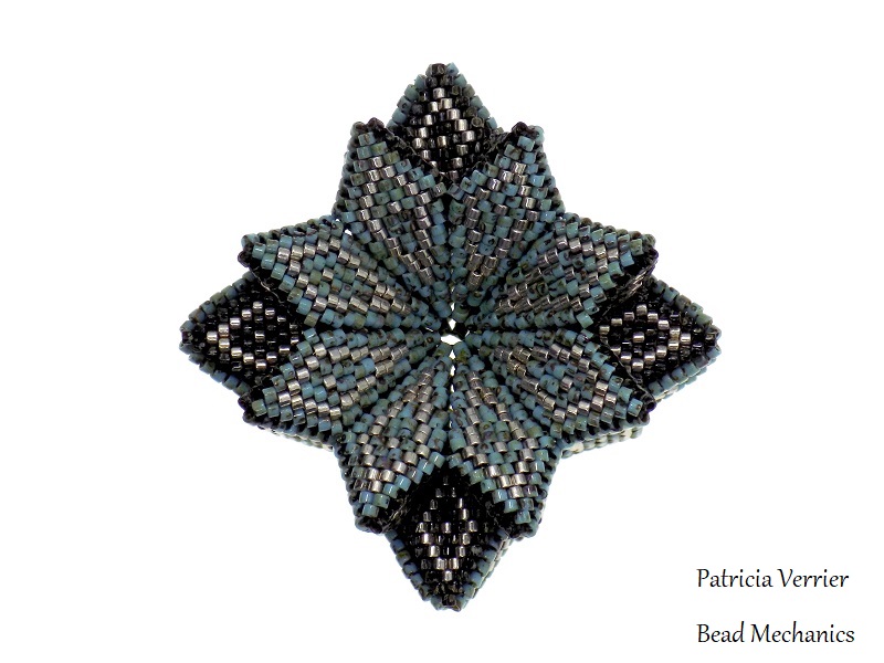 It’s interesting to see just how different it can be made to look! However, it is also however very fragile, as the peyote squares put the corner beads under a lot of pressure, so you need to be very very careful with it (I had a sliver of glass ping off one of the beads while folding it into a different shape!).
